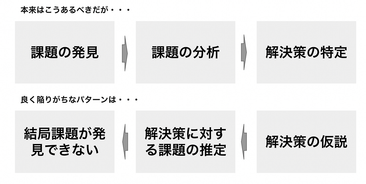 新しいプロダクトや新機能のアイデアを考える上で良く陥るミスが、課題の特定や分析を飛び越えて最初から顧客の課題解決策の特定を始めようとしてしまうことではないでしょうか? 具体的な課題に紐づかない解決策には価値がないことは直感的にも自明だと思いますが、ついつい先に答えを求めてしまうのが人間の性でしょう。こんな機能やサービスがあったら良いだろうと頭の中で想起をして、それが解決する課題をその後始める、という経験は誰にでもあるのではないでしょうか?